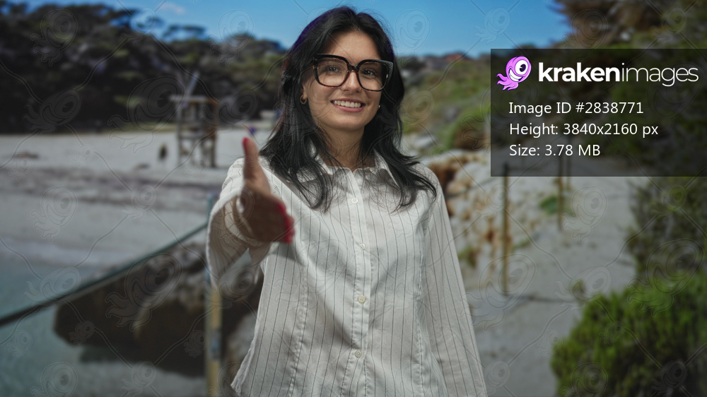 Woman extends hand for handshake at beach while smiling in white shirt and glasses under blue sky; friendship.