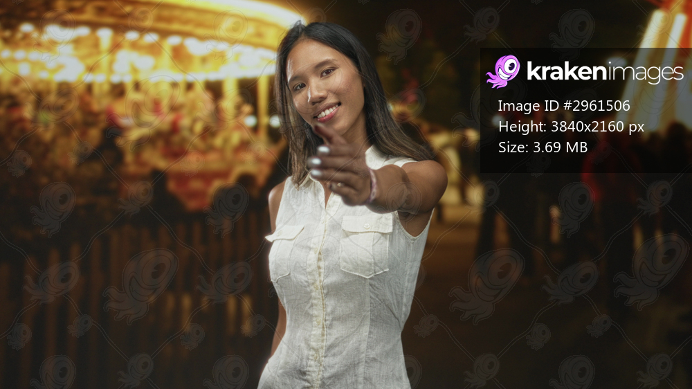Woman extends hand for handshake at street carnival by illuminated carousel, smiling and offering welcome while wearing white sleeveless shirt; welcoming invitation. - Kraken Images