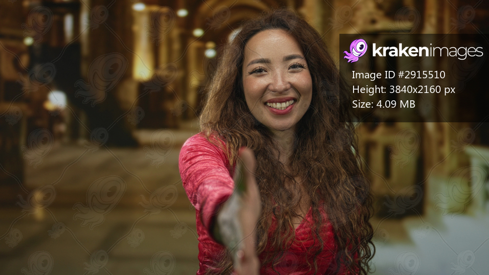 Woman extends hand for handshake in church interior, smiling and offering greeting; joy hospitality connection.