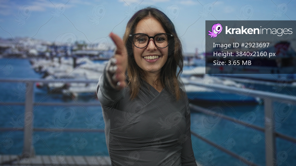 Woman extends hand for handshake on street by boats at port pier, smiling and reaching forward with visible hand and glasses; friendly welcome.