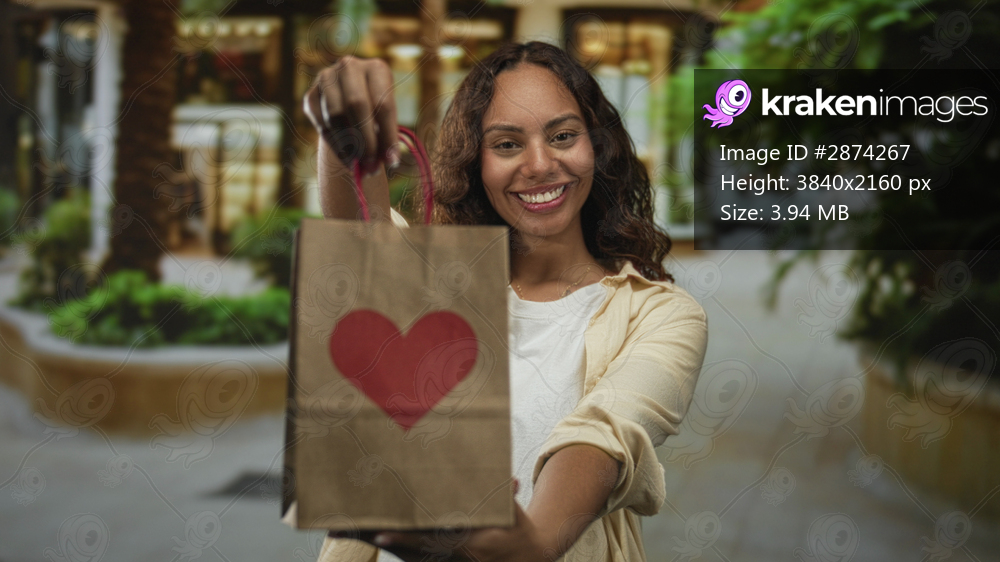 Woman extends hand holding a paper shopping bag with a red heart in an outdoor street mall storefront, smiling and offering a gift; gift giving joy.