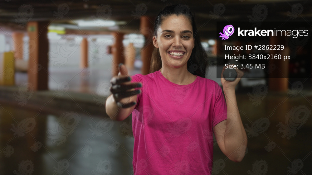 Woman extends hand in handshake while holding a 1kg dumbbell by a white hatchback car in an underground parking garage; friendship.