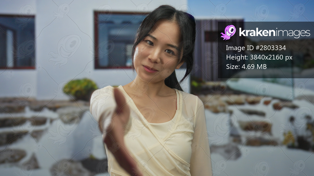 Woman extends hand outdoors near modern house on sunny day embodying welcome and friendship.