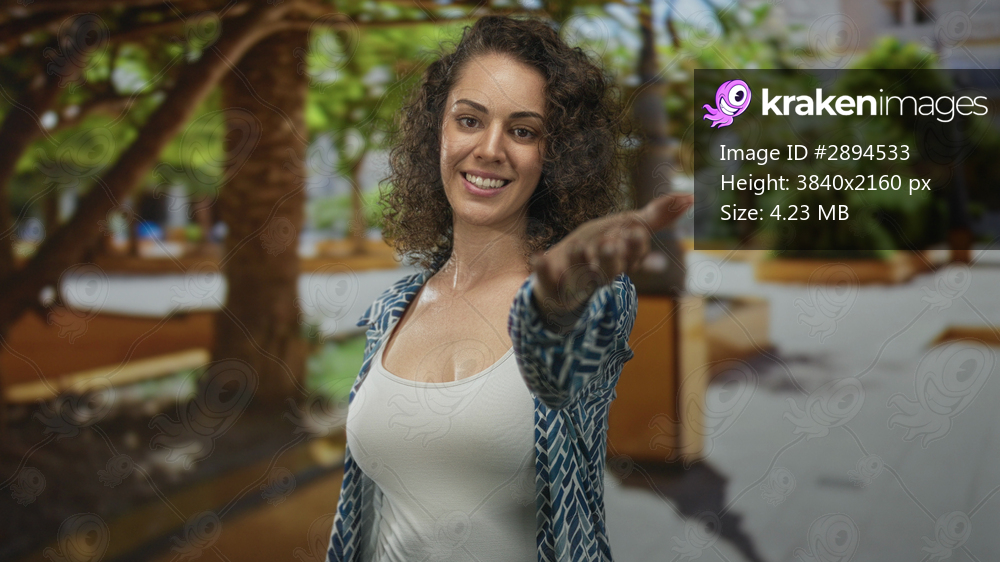 Woman extends hand palm up toward camera in a forest park plaza, smiling while reaching out in sunlight and greenery; welcoming invitation.