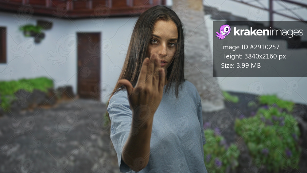 Woman extends hand toward camera in building courtyard near wooden balcony and door; defiance challenge boundary.