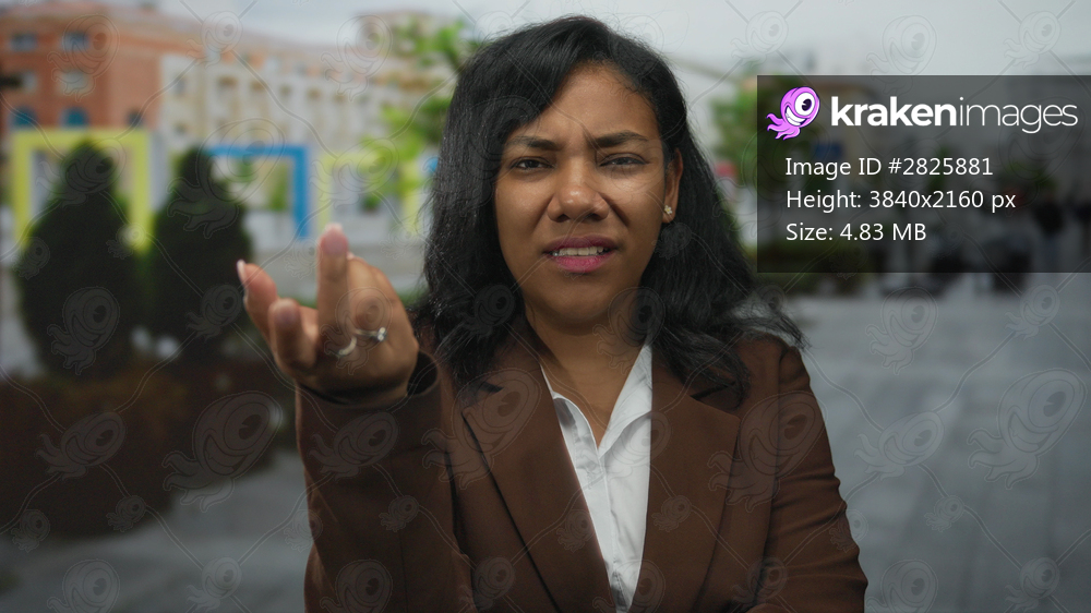Woman extends hand towards camera in busy urban street with blurred buildings in the distance; confusion.