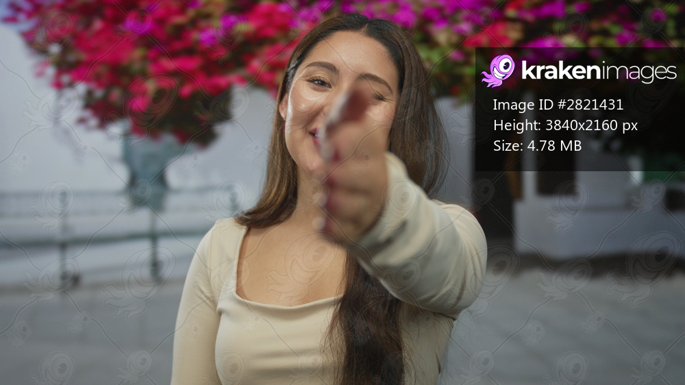 Woman extends her hand for a friendly handshake on a city street with historic railings and blooming bougainvillea; friendly greeting.