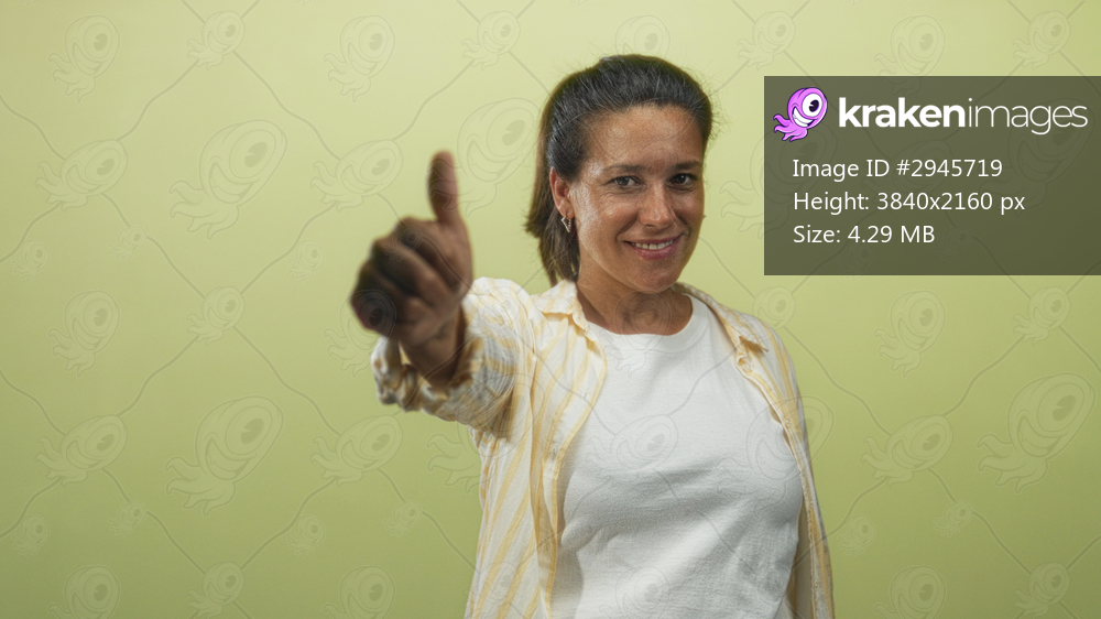Woman extends outstretched hand showing thumbs up in studio, wearing yellow striped shirt and white tshirt; warmth.