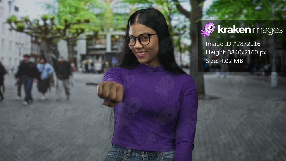 Woman with eyeglasses showing a raised fist gesture on a cobblestone city street with blurred pedestrians; confidence empowerment.