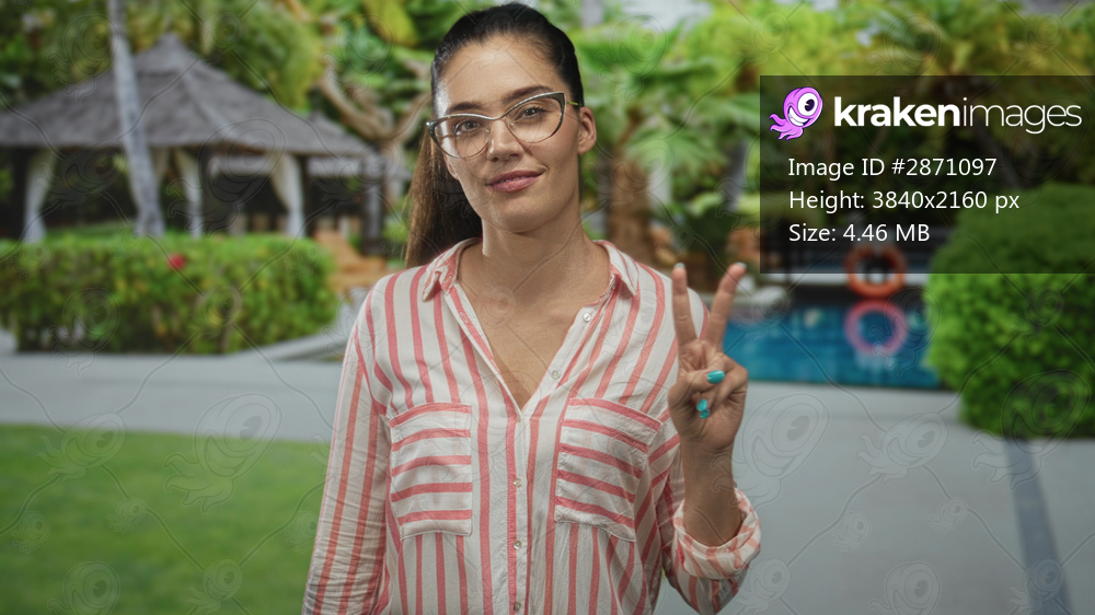 Woman with eyeglasses smiles and makes peace sign with fingers outside building near palm tree; playful.