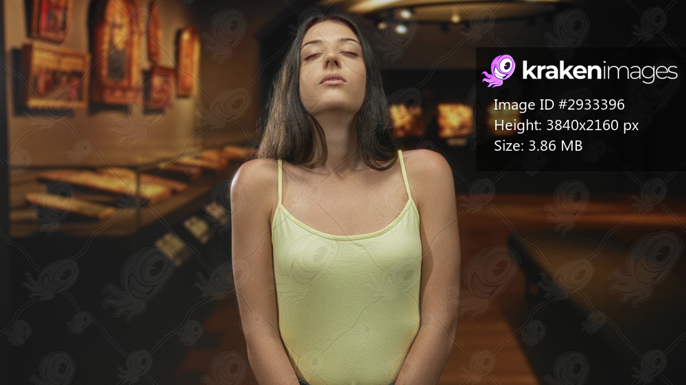 Woman with eyes closed and bare shoulders standing still before framed paintings in an art gallery building under soft warm lighting; contemplation calm serenity. - Kraken Images