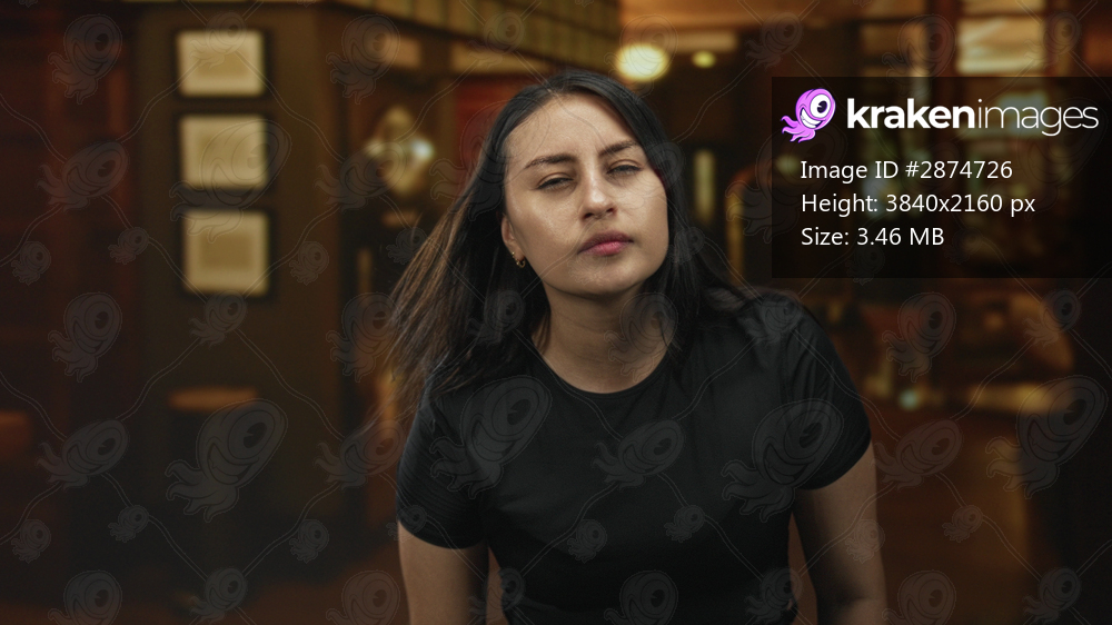 Woman with eyes closed leaning forward in hotel building, wearing black shirt and tilting head slightly; fatigue contemplation.