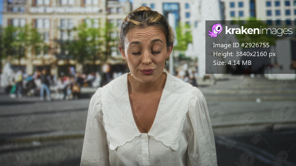 Woman with eyes closed and lips pursed standing on a busy street in front of a building with commuters; calm reflection.