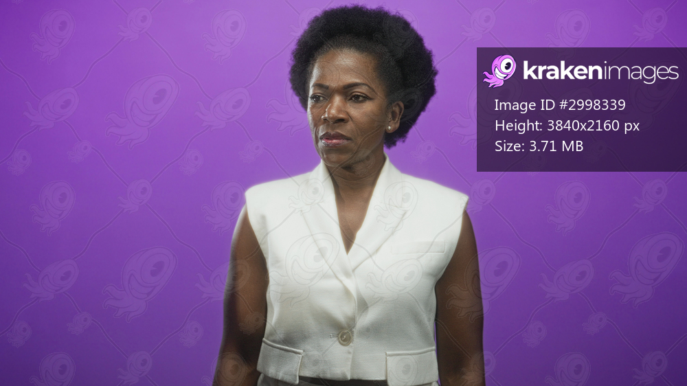 Woman with eyes closed and right hand moving in a purple studio wearing a white sleeveless vest, frontal waist up pose and slight frown facing camera; serene reflection. - Kraken Images