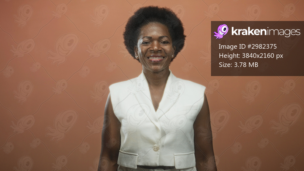 Woman with eyes closed smiling, wearing a white sleeveless vest and small earrings, afro hair, standing centered against a studio brown backdrop; serenity. - Kraken Images