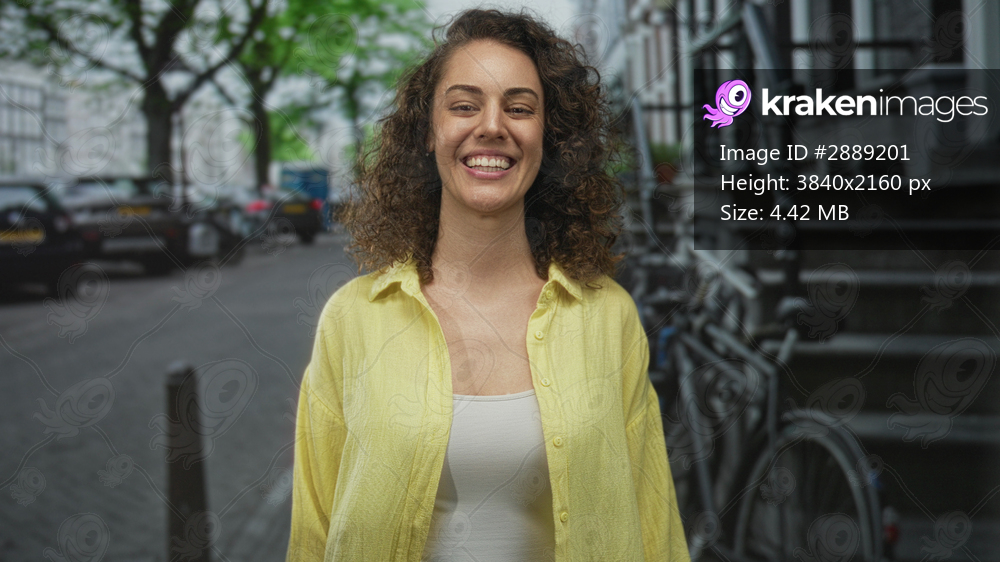 Woman with eyes closed and visible chest standing on a city street by bicycles and stone steps, wearing yellow shirt; serenity.