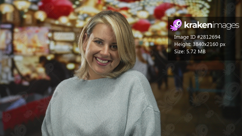 Woman face closeup smiling on street lined with souvenir stalls and glowing lanterns; happiness exploration.