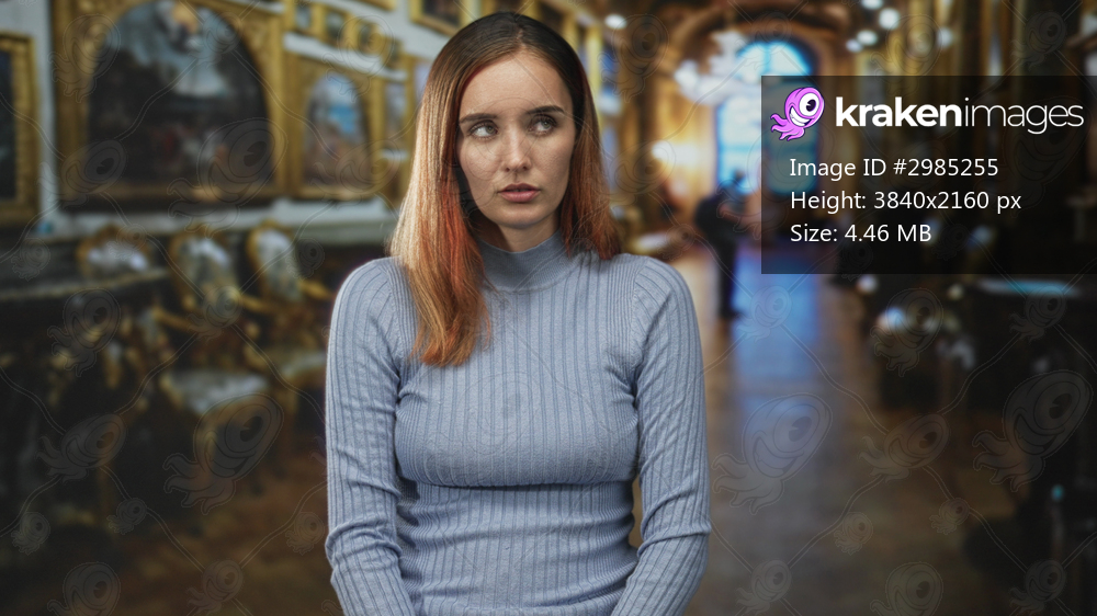 Woman face with eyes closed seated in an ornate museum hall building, wearing blue turtleneck and auburn hair; quiet melancholy.