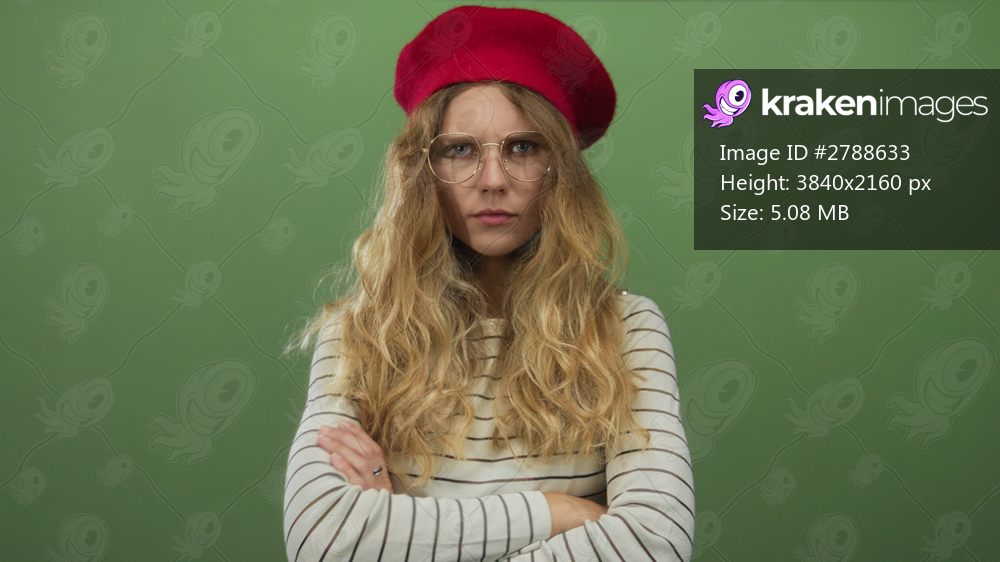 Woman face with foldedarms in studio showcases blonde young subject against green backdrop wearing beret and glasses serious.