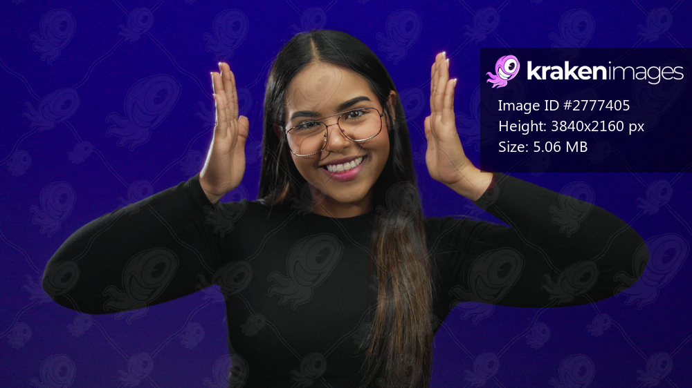 Woman face framing background creates stylish young latin hispanic isolated blue wall portrait that highlights expressive grin and confident gaze.