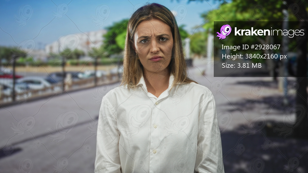 Woman face frowning and pursing lips on a sunny city street wearing white shirt; disgust urban commute.