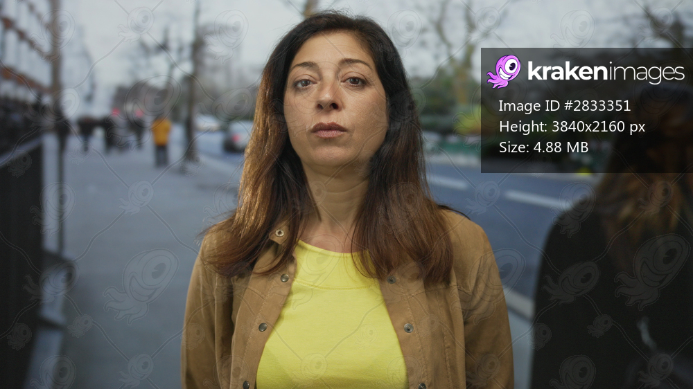 Woman face gazes directly on urban street in yellow shirt and brown jacket with neutral expression; determination.