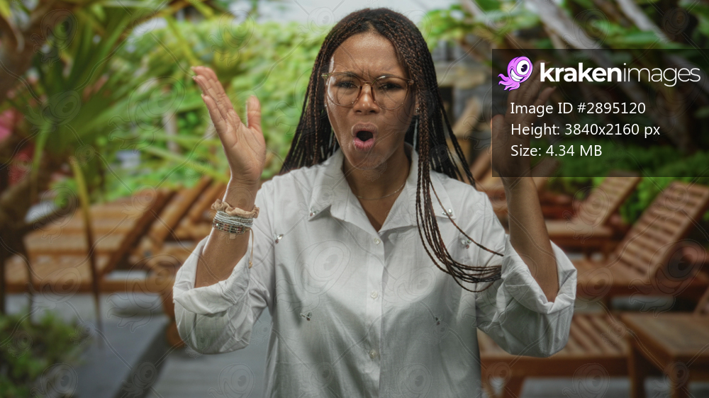Woman face with hands raised in shrugging gesture at building entrance, open mouth and raised palms showing upset; frustration questioning.