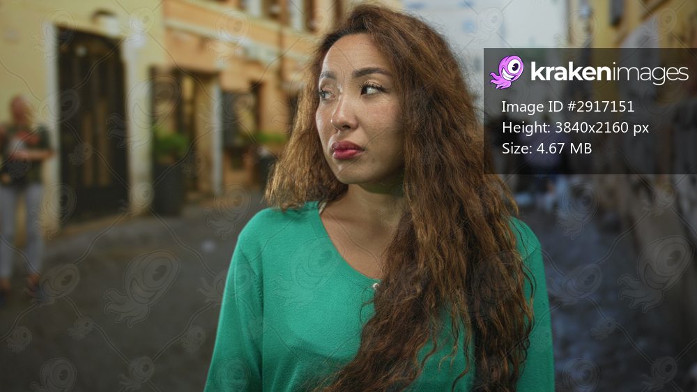 Woman face looking at camera in street, long wavy hair, visible collarbone, wearing green sweater, neutral expression; quiet contemplation.