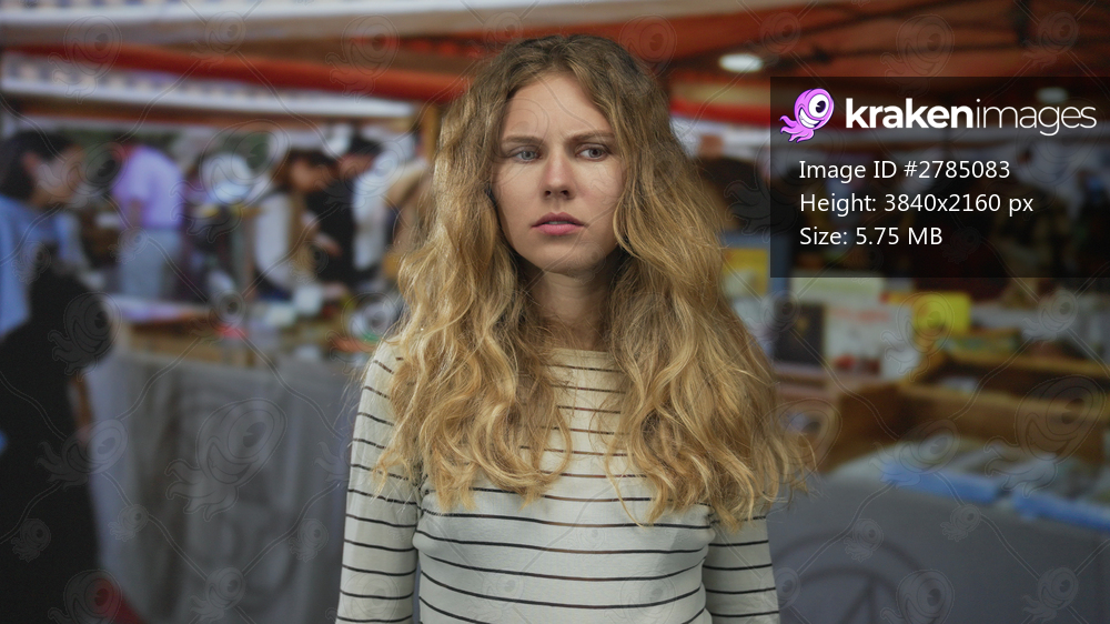 Woman face looking at market stalls shows blonde young figure with wavy striped top and a concerned expression blending into the crowd.