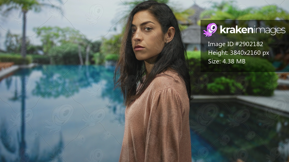 Woman face looking sideways at resort pool in profile, eyes closed and thoughtful expression; serenity reflection.