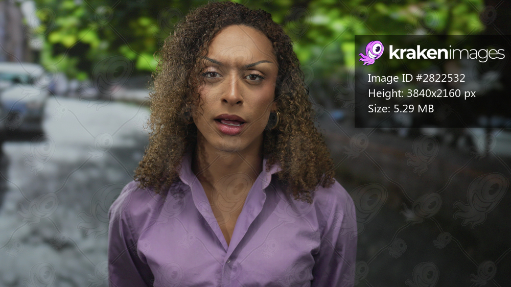 Woman face looking up on quiet city street under dappled sunlight through leafy trees with furrowed eyebrow; thinking reflection introspection contemplation. - Kraken Images