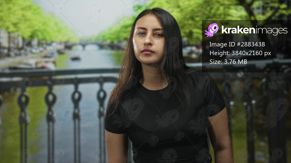 Woman face looks at camera on amsterdam street bridge with uncovered arms and neutral gaze; quiet contemplation.