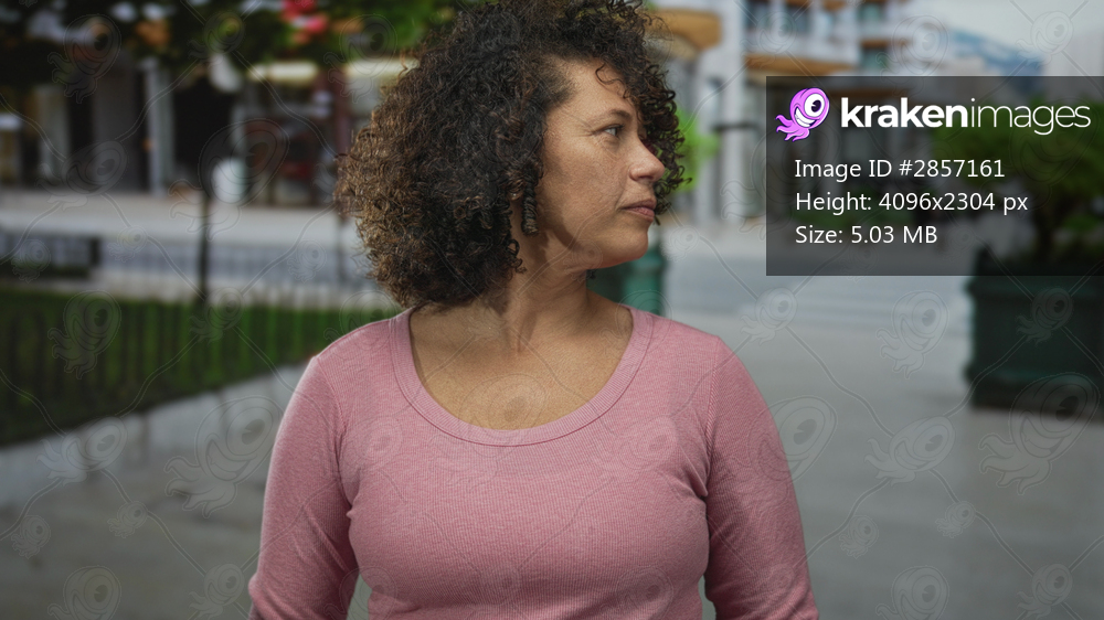 Woman face looks sideways on street framed by fence and planter beside urban sidewalk; inner serenity.