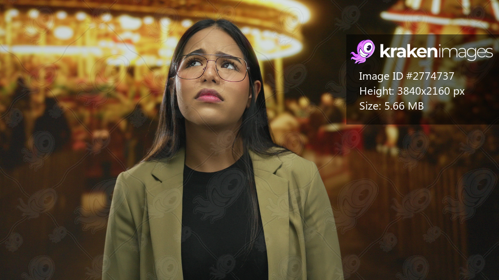 Woman face sad fair night outdoor young latin hispanic glasses detail conveys deep solitude.