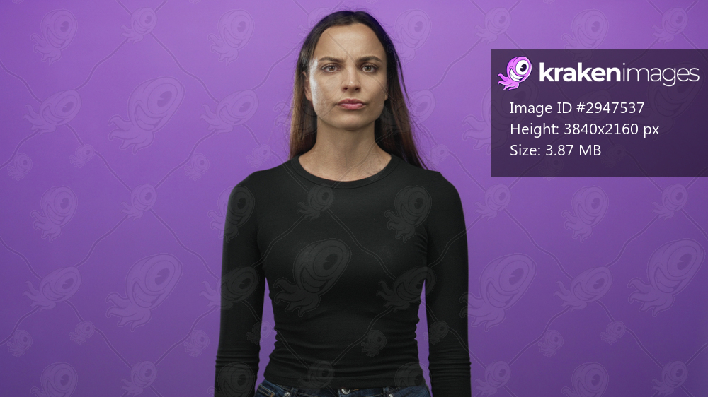 Woman face scowling and looking sideways in purple studio wearing black long sleeve top and jeans; skepticism.