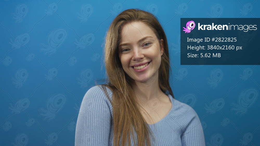 Woman face smiling in blue studio wearing ribbed pullover and long hair falling over shoulder; joy.