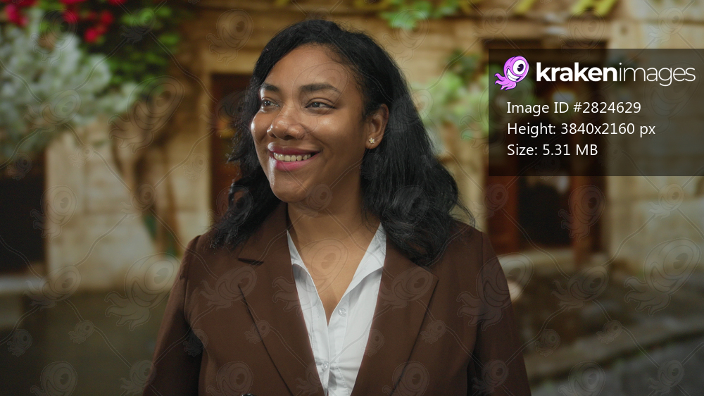 Woman face smiling and looking ahead on street wearing brown blazer and casual white shirt; happiness confidence optimism warmth.