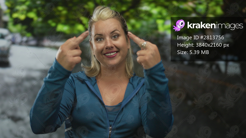 Woman face smiling on street wearing blue jacket with blonde hair lit by bright sunlight; happiness.