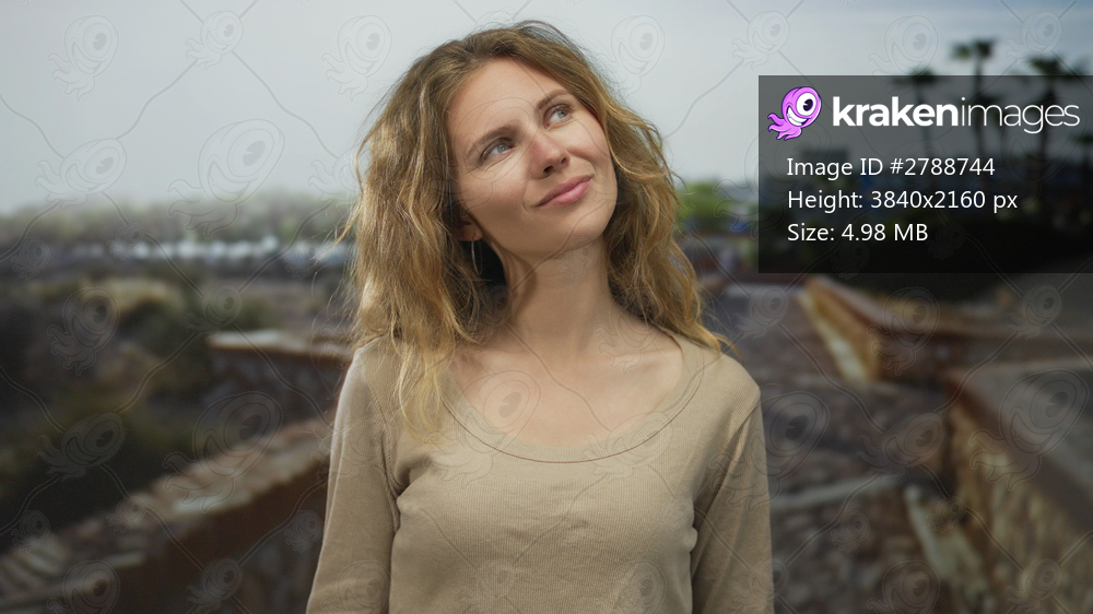 Woman face smiling outdoor blonde young content railway nature dreamy setting evokes calm emotions.