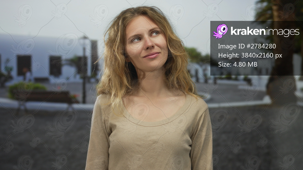 Woman face smiling street blonde young hair portrait town outdoor captures casual wanderer spirit.