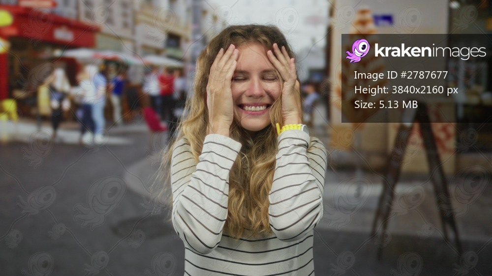 Woman face surprised street blonde young smile hair urban outdoor portrait captures joyful reaction.