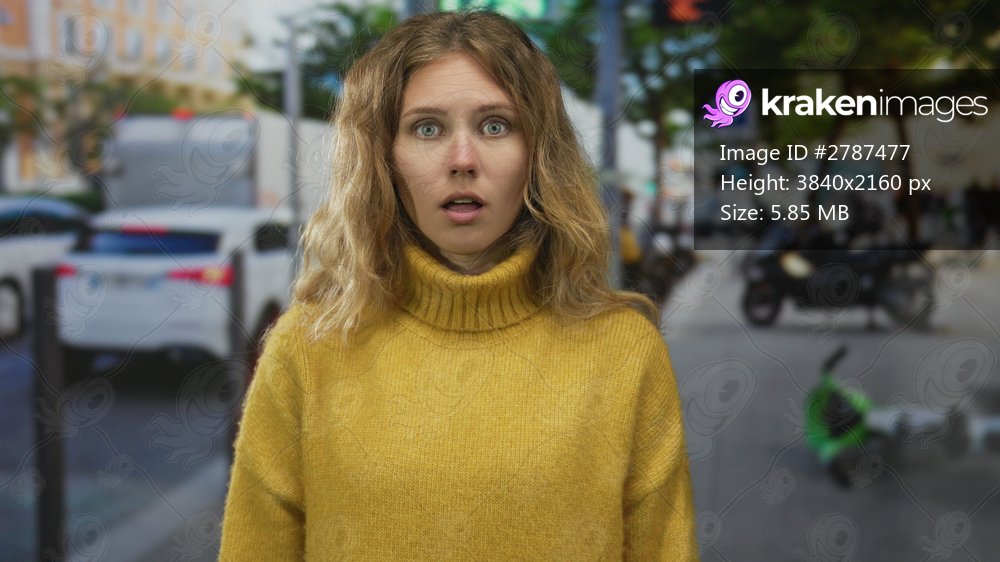 Woman face surprised street blonde young turtleneck city urban outdoors.