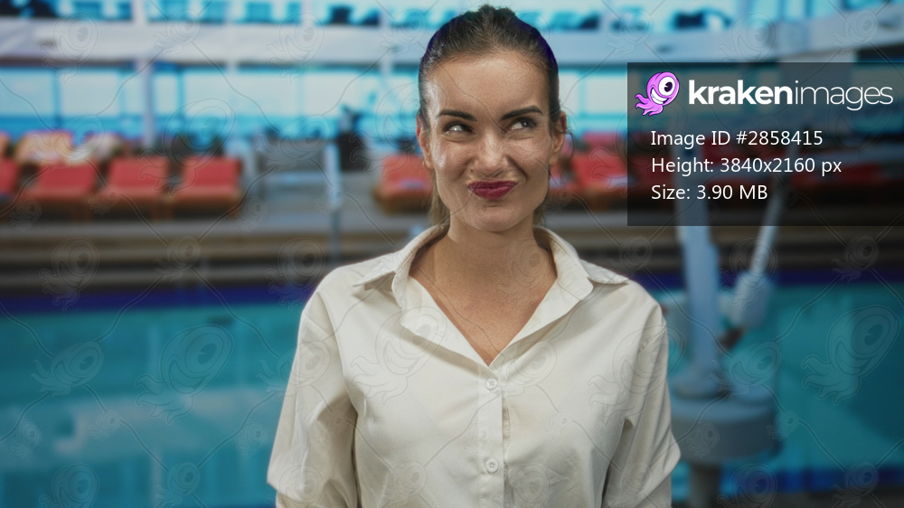 Woman face with thumb to ear for call on blue cruise pool deck inside building wearing white shirt and smiling expression; playfulness.