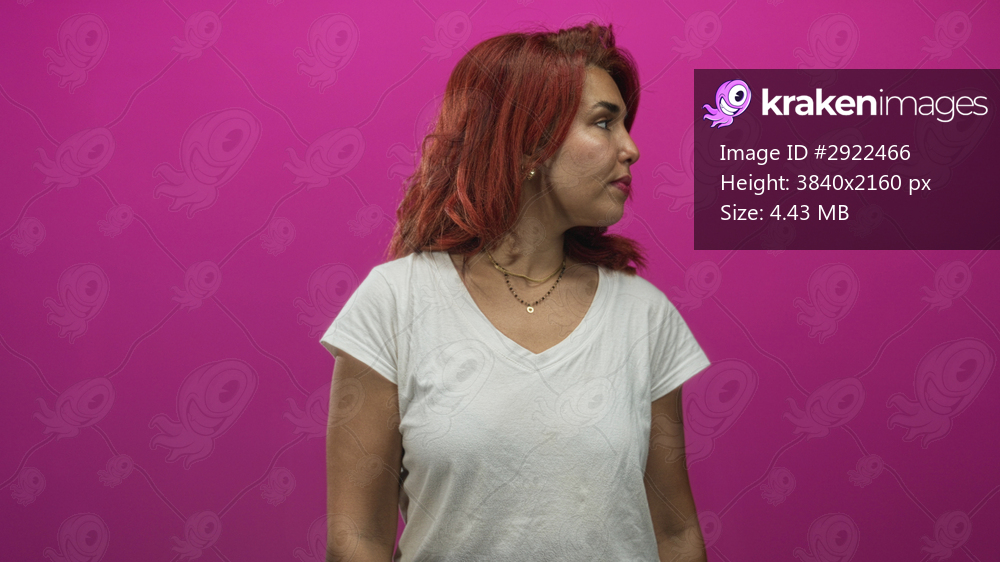 Woman face turned left, wearing white tee and necklaces, gaze averted in a studio with magenta backdrop; calm contemplation.
