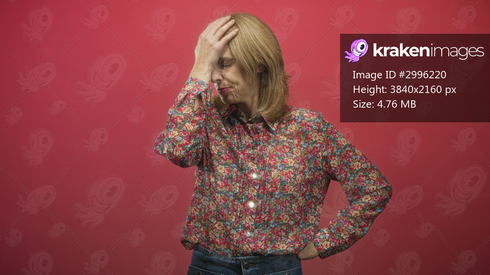 Woman facepalming with hand on forehead wearing floral blouse and jeans in studio; frustration everyday life.