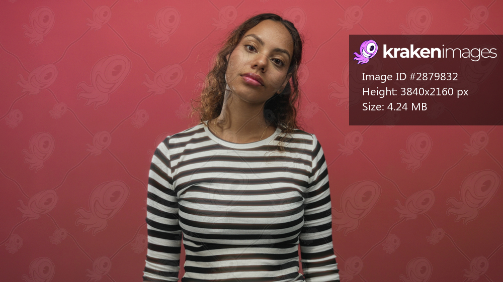 Woman facing camera with visible face and chest wearing striped shirt and slight smile in pink studio; quiet poised confidence.