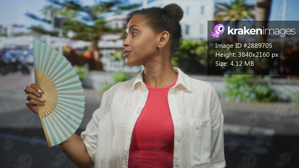 Woman fanning with a folding fan on a sunny street plaza near palm trees and a building, holding fan to cool face; playful confidence.