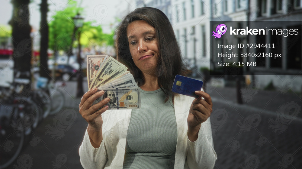 Woman fanning banknotes and holding creditcard, counting cash on street in urban plaza wearing white jacket and green top; uncertainty finances decision. - Kraken Images
