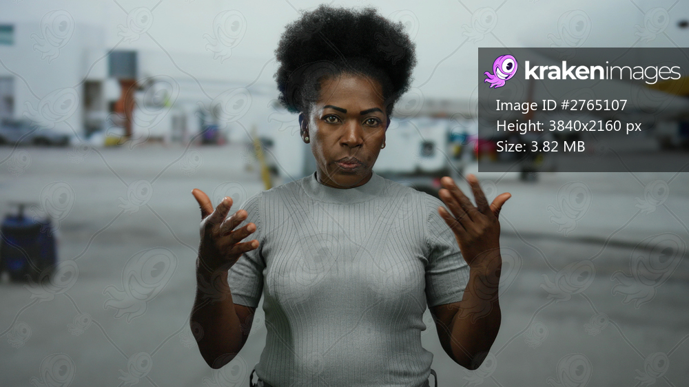 Woman fanning herself with hands in outdoor airport terminal, showcasing travel fatigue expression.