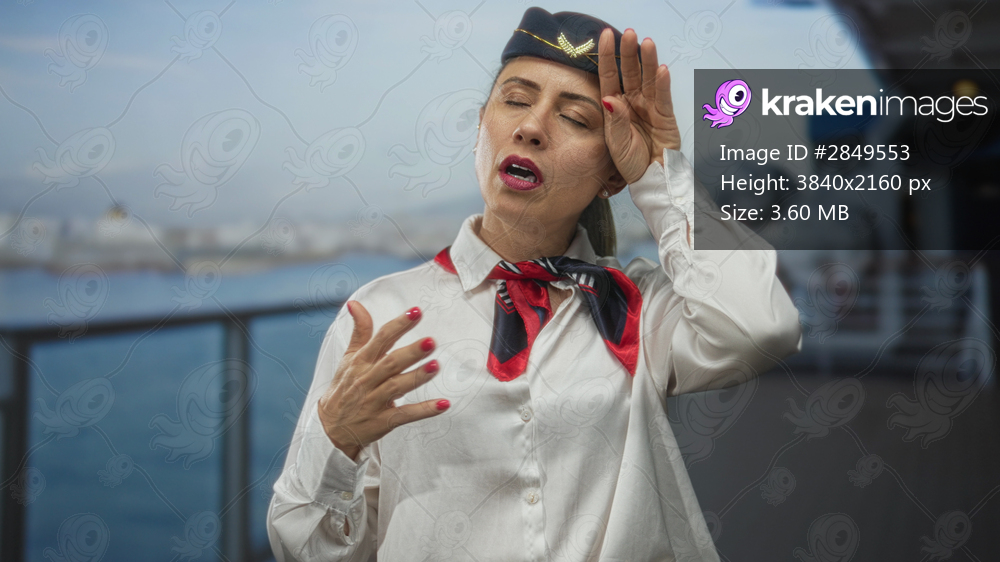 Woman fans air across face on cruise ship deck during midday heat while shading her eyes; overheating.